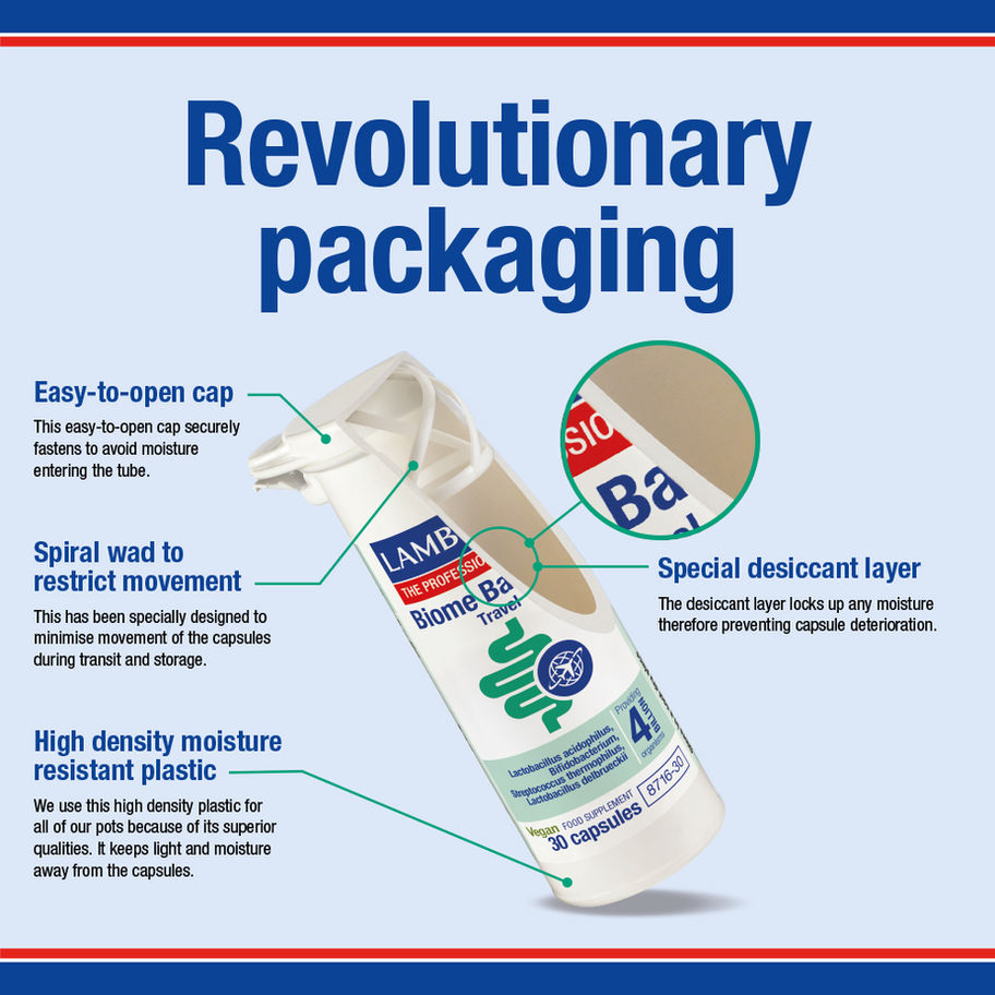 Biome Balance Travel contains four carefully selected strains of friendly bacteria, Bifidobacterium bifidus, Lactobacillus Acidophilus, Streptococcus thermophilus and Lactobacillus delbrueckii. These species of bacteria are specially selected for use when travelling, as local cuisine can expose the gut to new bacteria strains and this can unsettle digestion.