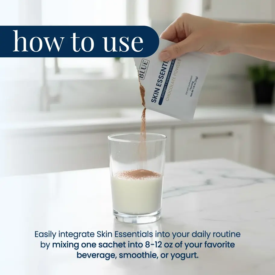 Easily integrate Skin Essentials into your daily routine by mixing one sachet into 8-12 oz of your favorite beverage, smoothie, or yogurt.